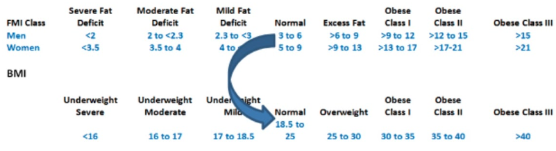 Additionally, we pay specific attention to the Fat Mass Index (FMI), reported above as “Fat Mass/Height^2”. The best way to think about FMI is that it is essentially the same as BMI if you took muscle mass out of the equation. The table below displays the different risk category groups for comparison.